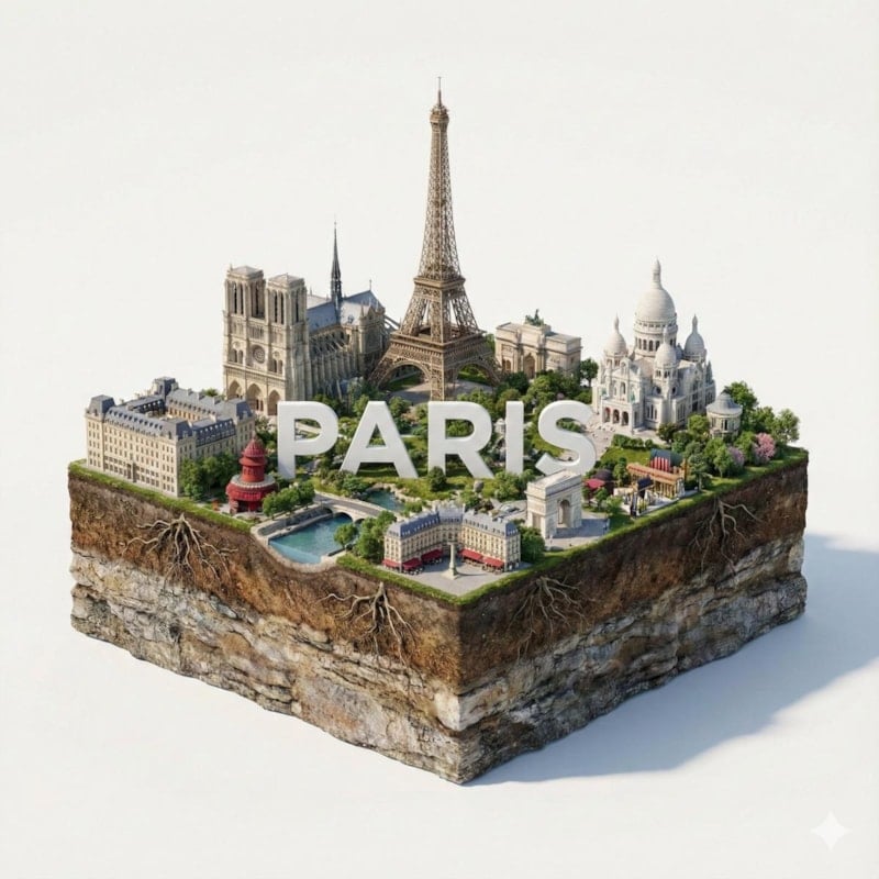 "Paris'in hiper-gerçekçi 3D kare dioraması; alt kısmında kayalar, kökler ve toprak katmanlarını gösteren kesitli bir zemin yapısıyla oyulmuş bir görünüm. Üstte: Paris'in ikonik yapıları, mimarisi ve kültürel öğelerini içeren, masalsı bir şehir manzarası. Modern ve sade “Paris” yazısı kompozisyona doğal bir şekilde entegre edilmiş. Tamamen beyaz stüdyo arka planı ve yumuşak doğal aydınlatma. DSLR fotoğraf kalitesinde net, canlı, büyülü gerçekçilik estetiğinde. Boyut: 1080x1080."