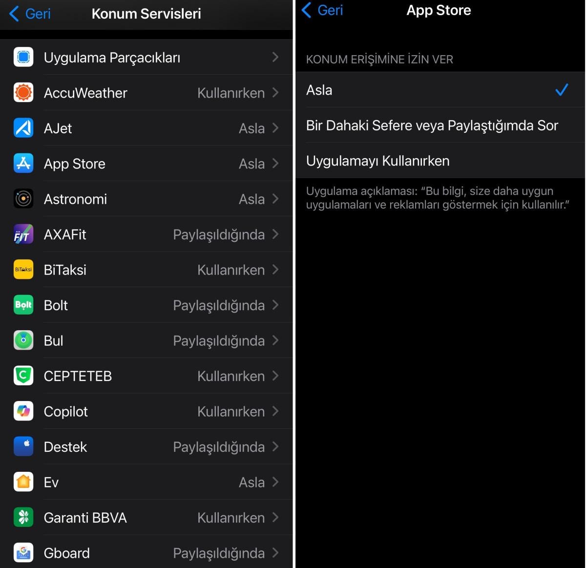 Hangi uygulamanın konum servislerini kapatmak istiyorsanız listeden seçin ve 'Asla' yı işaretleyin.