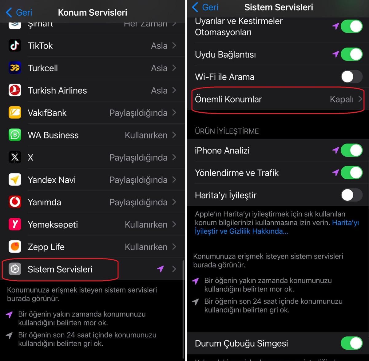 Ayarlar > Gizlilik ve Güvenlik > Konum Servisleri > Sistem Servisleri bölümüne gidin.