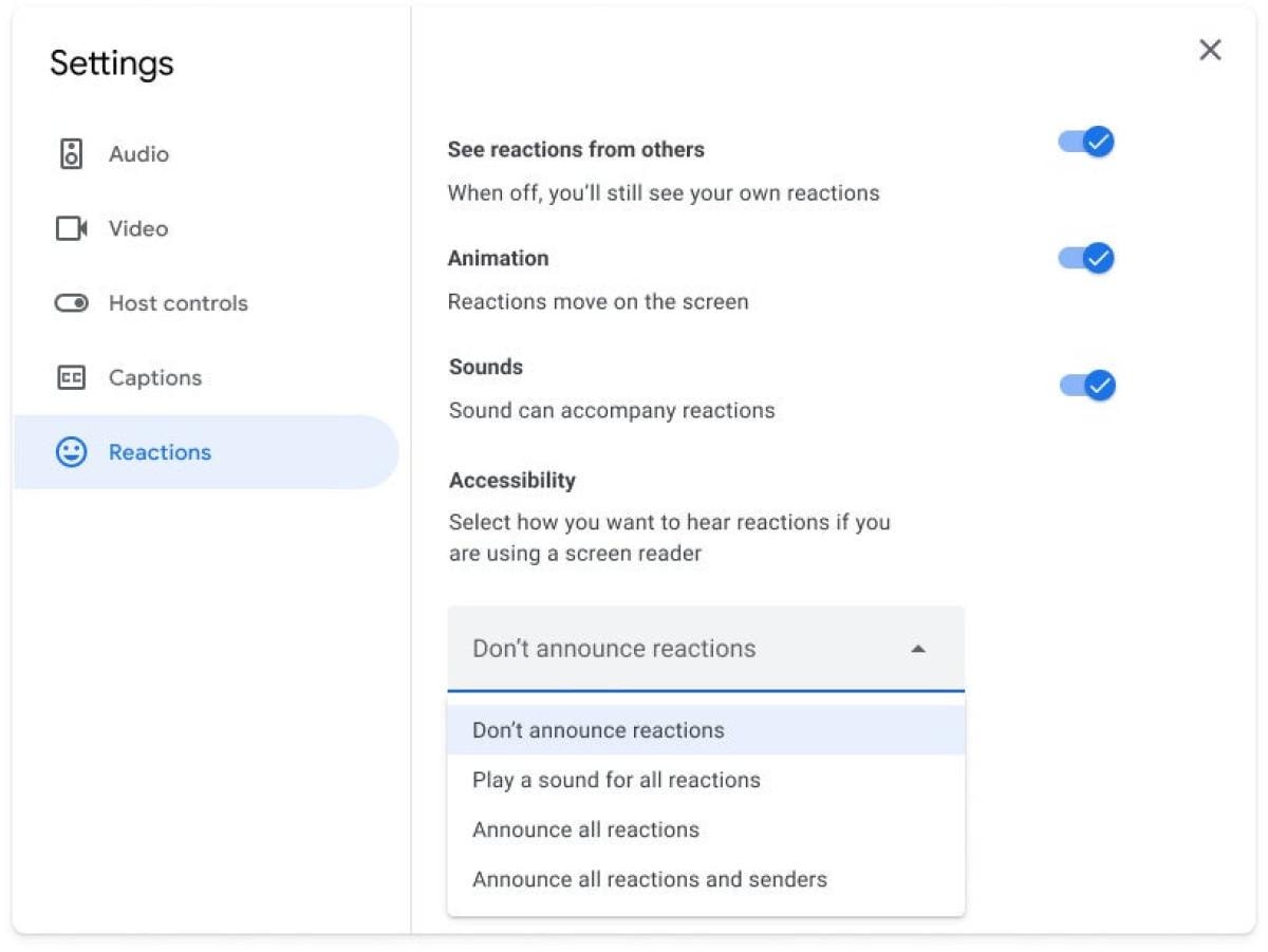 Yeni güncelleme ile birlikte, Google Meet'te tepkilerin ekran okuyucular aracılığıyla nasıl deneyimlendiğine ilişkin birkaç seçenek daha eklendi.