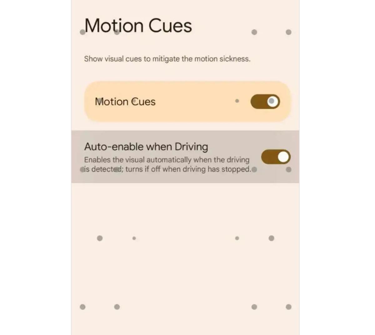 Motion Cues, kullanıcıların tercihlerine göre özelleştirilebilecek. Özellik, hareket halindeyken otomatik olarak etkinleştirilebilecek veya manuel olarak kontrol edilebilecek.
