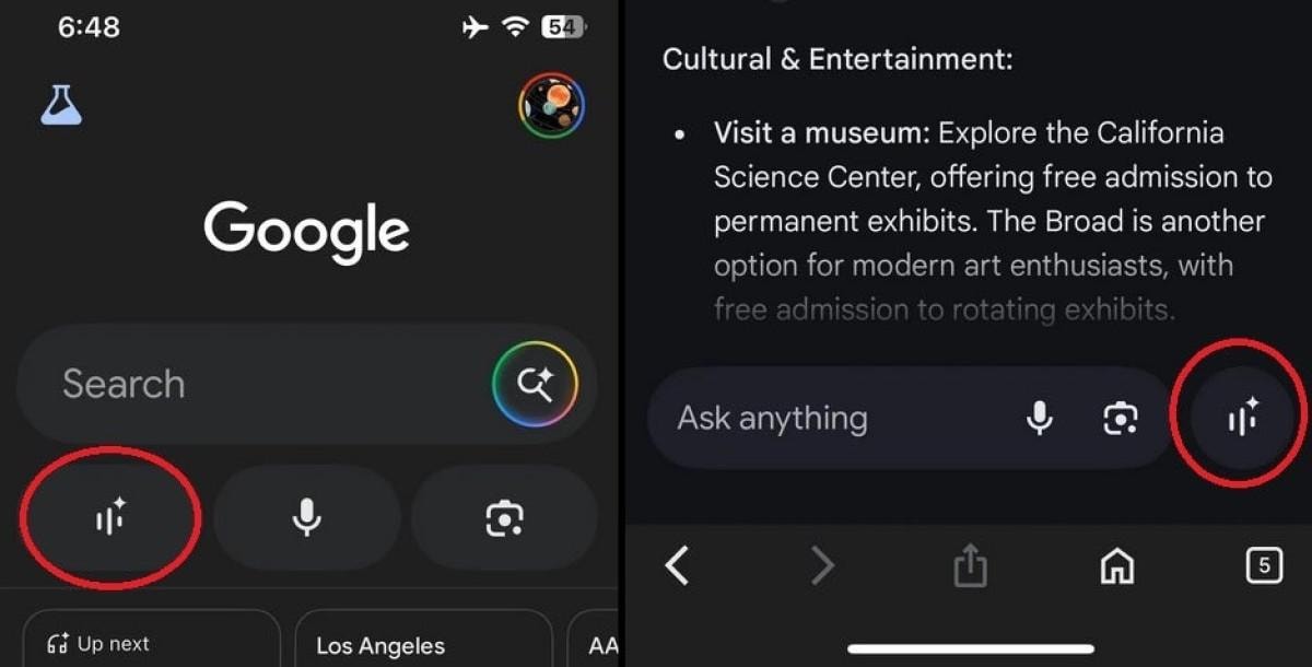 Bu simgeye dokunarak Search Live ile bir sohbet başlatabilirsiniz. Alternatif olarak, AI Modu sohbetlerindeki metin alanının sağındaki dairesel düğme de bu özelliği aktif hale getiriyor.
