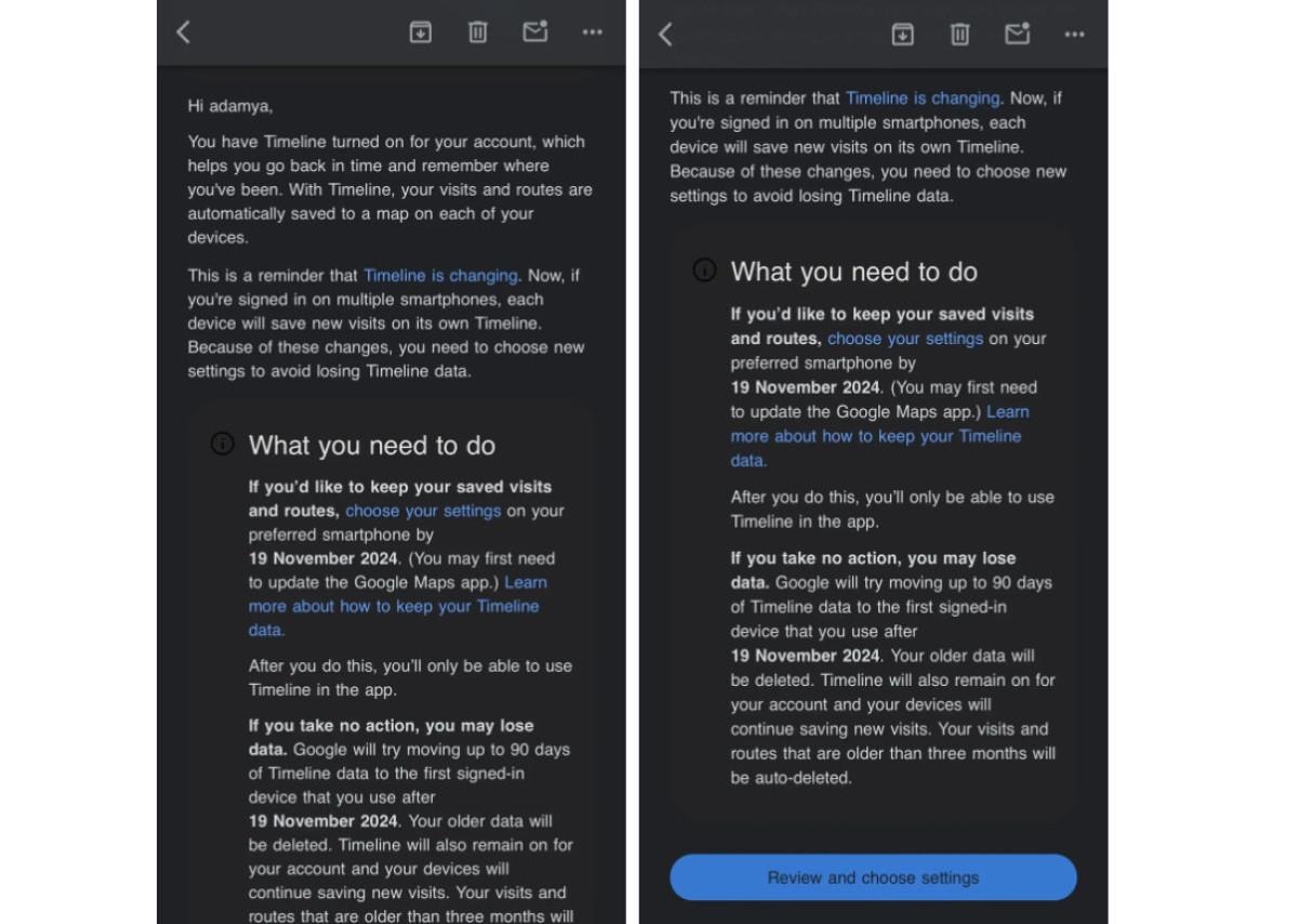 Kullanıcılar, aksi yönde bir tercihte bulunmadıkları takdirde üç aydan eski Google Haritalar Zaman Çizelgesi verilerinin silineceği konusunda Google'dan e-postalar alıyor.