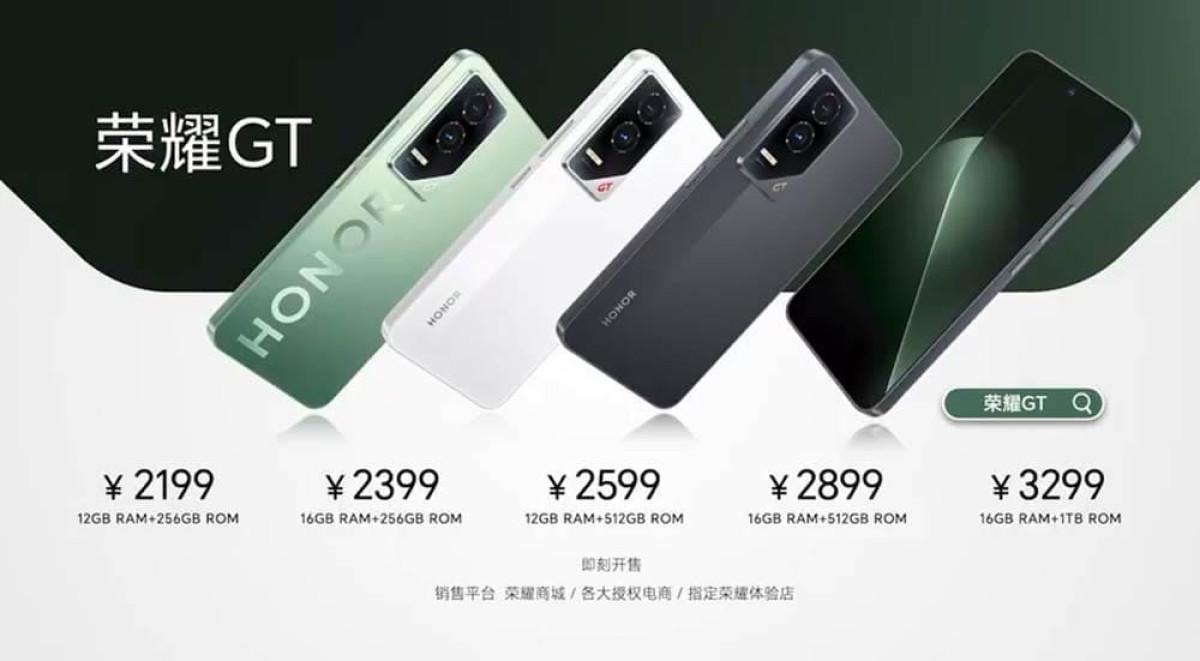 Honor GT, Çin'de 300 dolardan başlayan fiyatlarla satışa sunuldu. 12 GB / 256 GB versiyonunun fiyatı 300 dolar, 16 GB / 1 TB versiyonunun fiyatı ise 455 dolar.