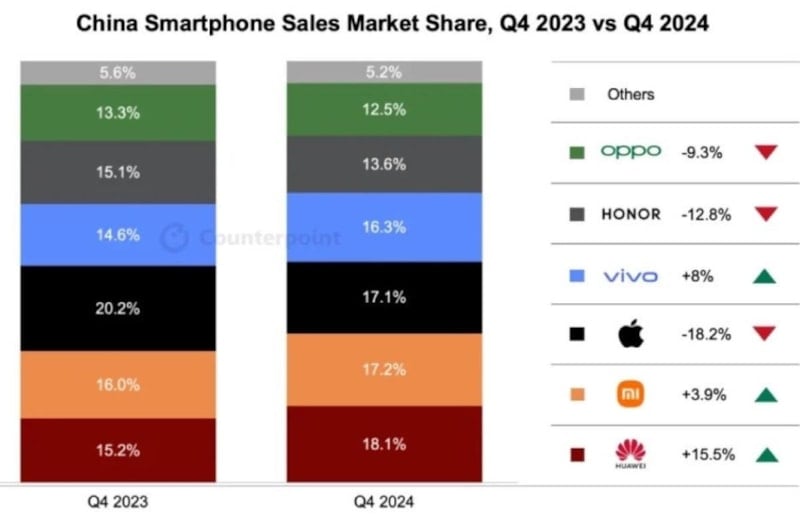 Counterpoint Research'ün raporuna göre; Huawei, 2024'ün dördüncü çeyreğinde Çin akıllı telefon pazarında yüzde 18,1'lik pazar payıyla birinci sıraya yerleşti. Apple ise yüzde 17,1'lik pazar payıyla üçüncü sırada kaldı.