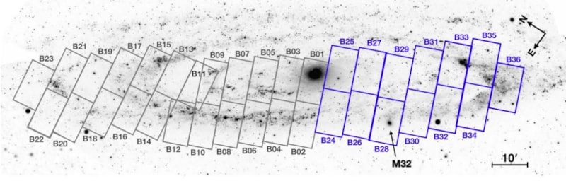 Mozaik, Andromeda'daki yaklaşık 200 milyon yıldızı ayrı ayrı gösteriyor. Mavi yıldız kümeleri, arka plan galaksileri, toz şeritleri ve uydu galaksiler gibi önemli detaylar görülebiliyor.