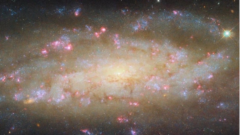 Hubble'ın gözlemleri, galaksideki yıldız aktivitesine odaklandı ve görüntüdeki parlayan pembe bölgelerin, yeni yıldızların doğduğu zengin gaz rezervleri olduğunu doğruladı.