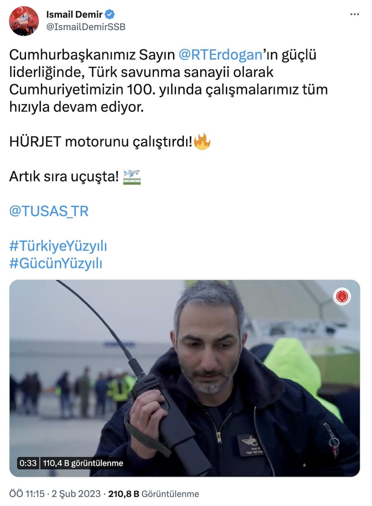 Savunma Sanayii Başkanı İsmail Demir, başarılı geçen motor denemesini, "Cumhurbaşkanımız Sayın Recep Tayyip Erdoğan'ın güçlü liderliğinde, Türk savunma sanayii olarak Cumhuriyetimizin 100. yılında çalışmalarımız tüm hızıyla devam ediyor. HÜRJET motorunu çalıştırdı. Artık sıra uçuşta!" ifadeleriyle duyurdu.