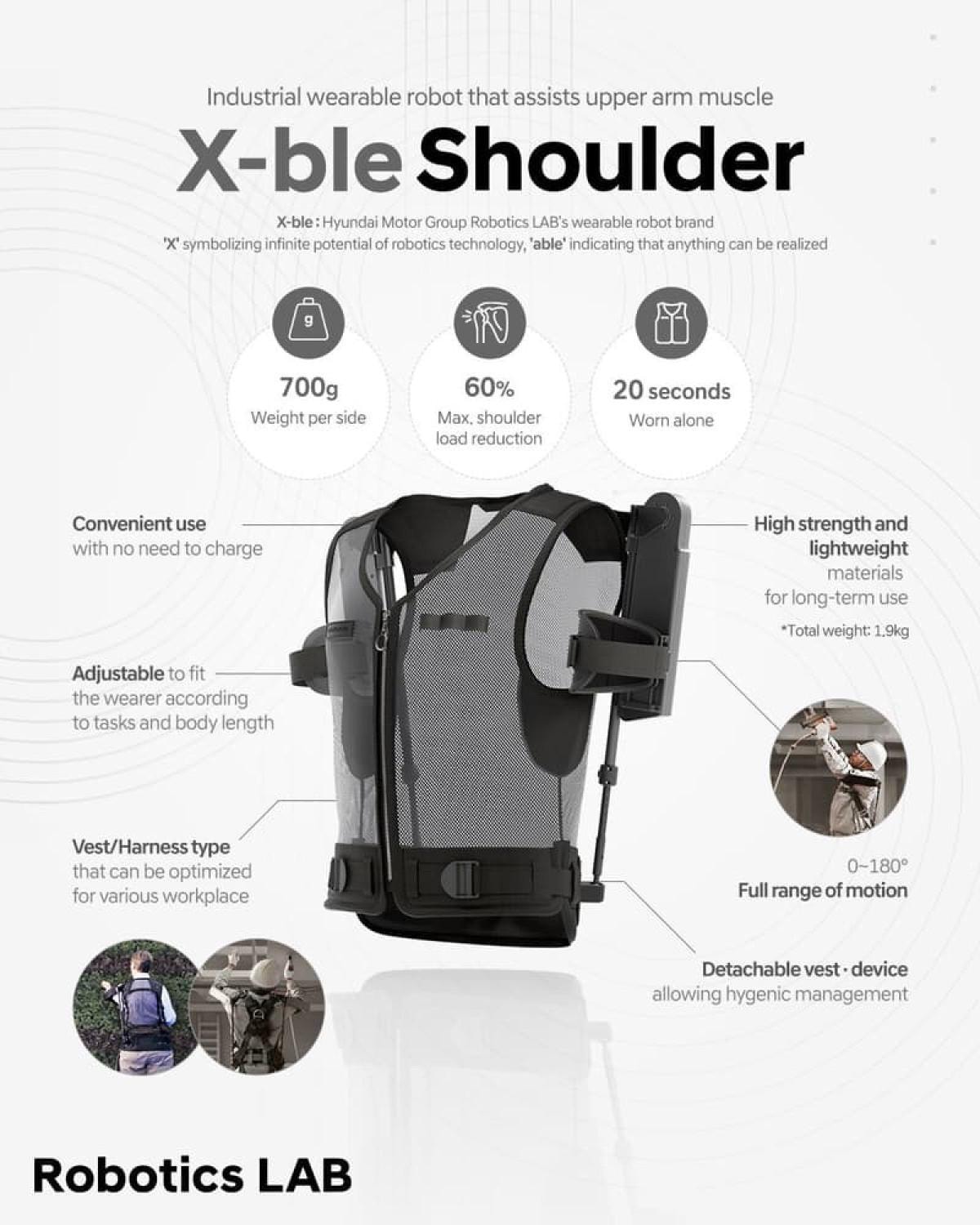 Hyundai Motor Company ve Kia Corporation, endüstriyel verimliliği artırmak ve kas-iskelet sistemi yaralanmaları ile yorgunluğunu azaltmak için tasarlanmış giyilebilir bir robot olan "X-ble Shoulder"ı oluşturmak için bir araya geldi.