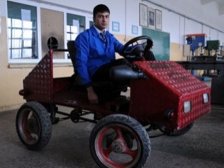 Iğdır'da biri hurdacı, diğeri de tornacı babanın çocukları olan iki lise öğrencisi, babalarından öğrendiklerini uygulayarak tek kişilik otomobil yapmayı başardı.