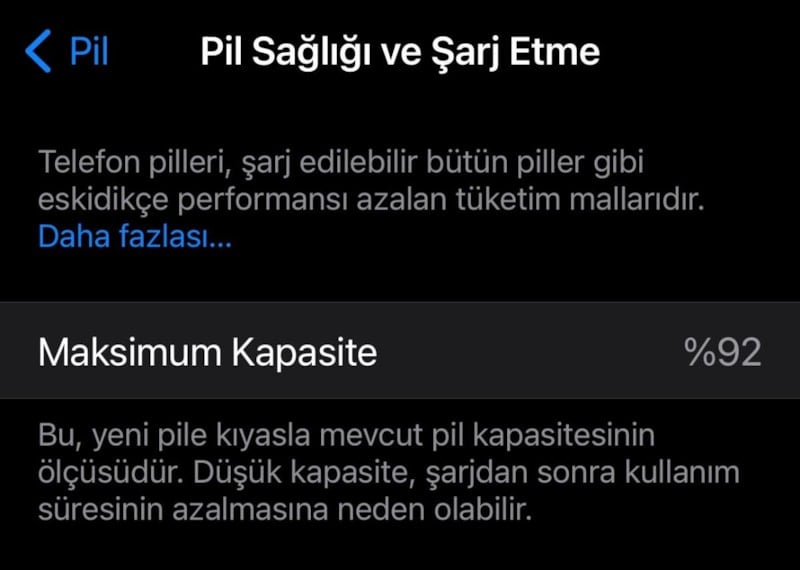 Ayrıca iPhone ayarlarından pil sağlığı seviyesini kontrol etmeyi unutmayın. Yüzde 85'in altına düşen pil sağlığı, ileride şarj sorunlarına neden olabilir.