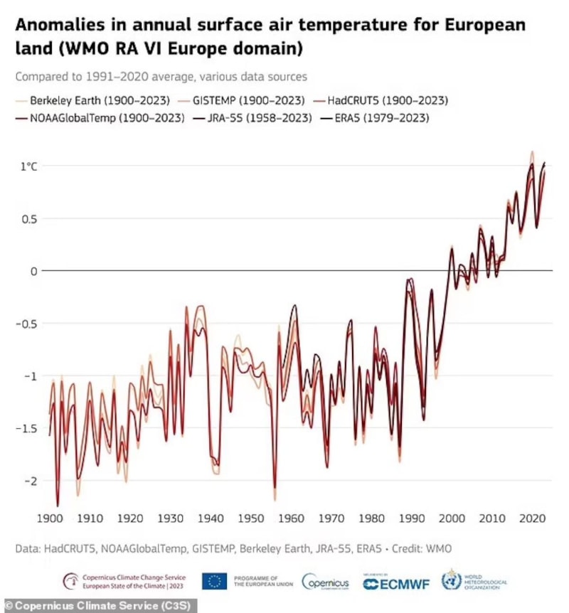 Her iki yılda da Avrupa'nın ortalama yüzey hava sıcaklığı (sıcak havanın Dünya yüzeyinden 2,5 metre yükseklikte olması) 1991-2020 ortalamasından 1°C daha yüksekti.