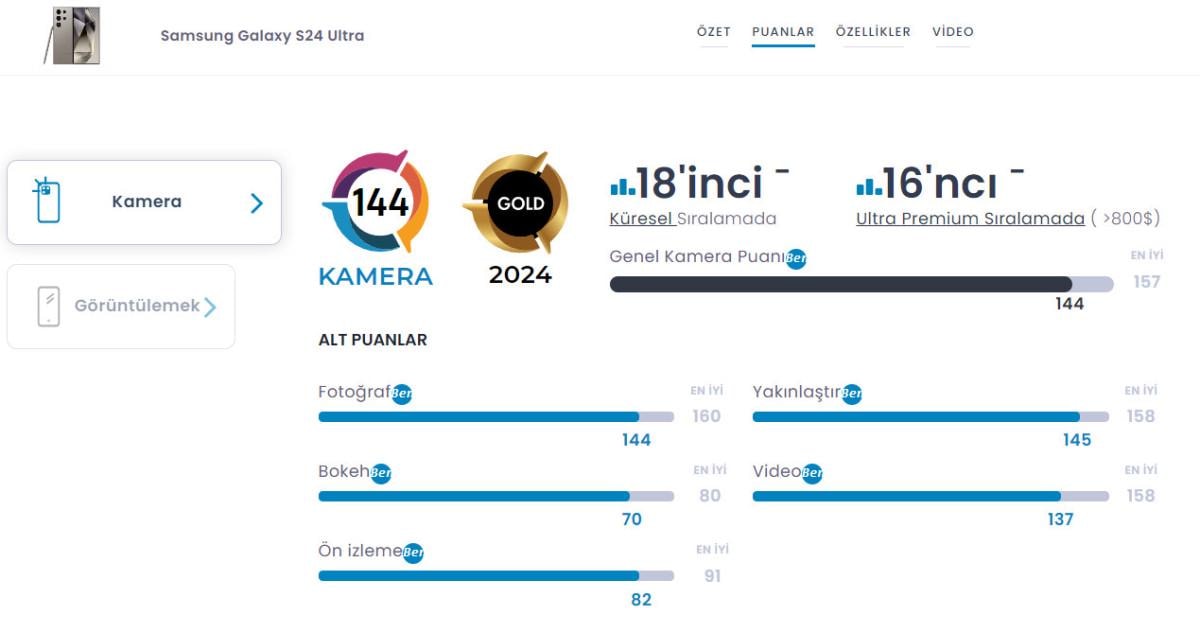 Galaxy S24 Ultra, portre ve grup fotoğraf/videolarında 137 puan alırken, düşük ışık koşullarında ise 115 puanda kaldı. Telefonun genel puanı ise 144 olarak açıklandı.