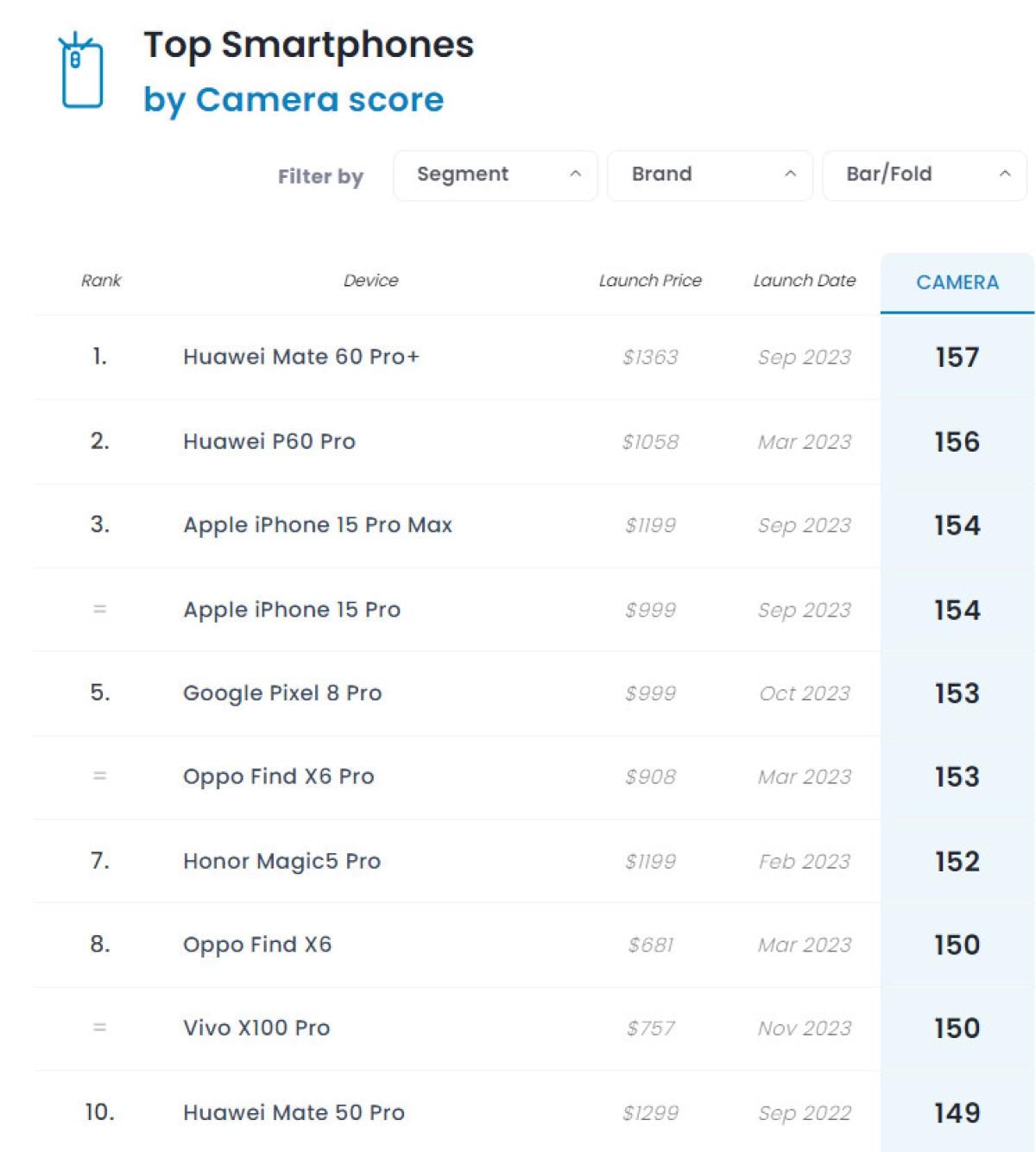 Kamera performansı açısından dünya sıralamasında ilk üçte 157 puanla Huawei Mate 60 Pro+, 156 puanla Huawei P60 Pro ve 154 puanla iPhone 15 Pro Max bulunuyor.