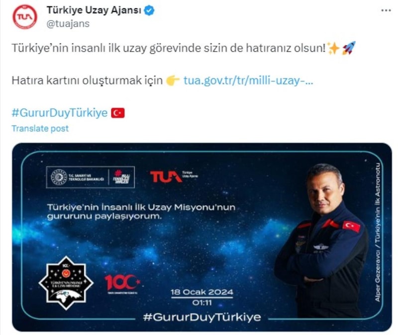 Ayrıca, "Türkiye'nin İnsanlı İlk Uzay Misyonu'nun gururunu paylaşıyorum." ifadeleri kullanıldı.