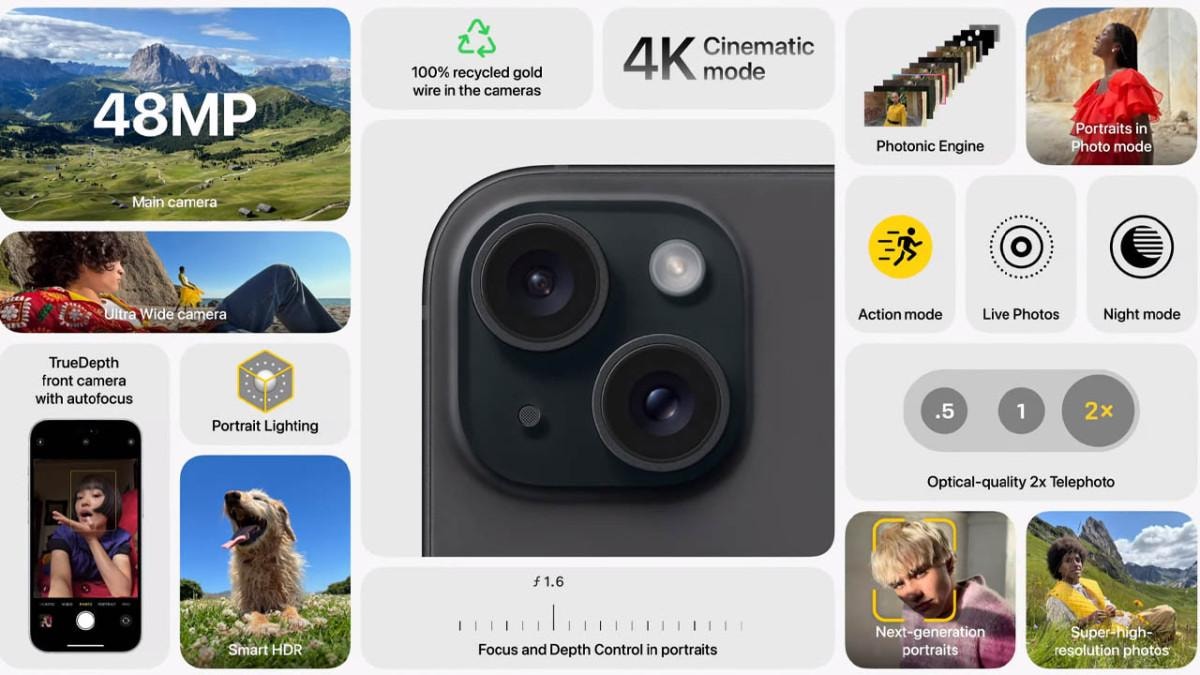 Apple ayrıca iPhone 15 kamerasındaki gece modunu, Canlı Fotoğraflar ve aksiyon modu ile de geliştiriyor. Selfie tutkunuysanız ön kamerada otomatik odaklama ve portre aydınlatma bulunuyor.