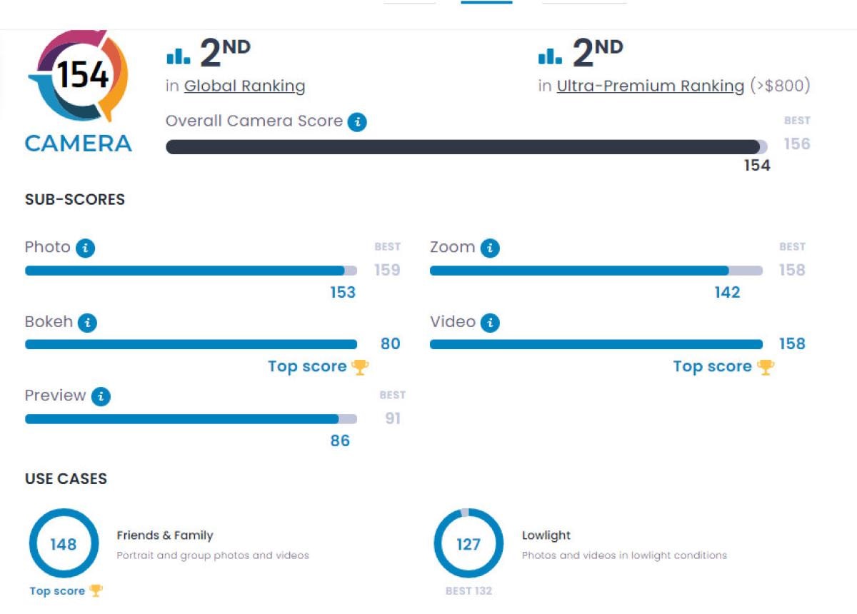 DxOMark'ın kamera testini başarılı bir şekilde geçen telefon, "en iyi kameraya sahip telefonlar" listesine ikinci sıradan girmeyi başardı.