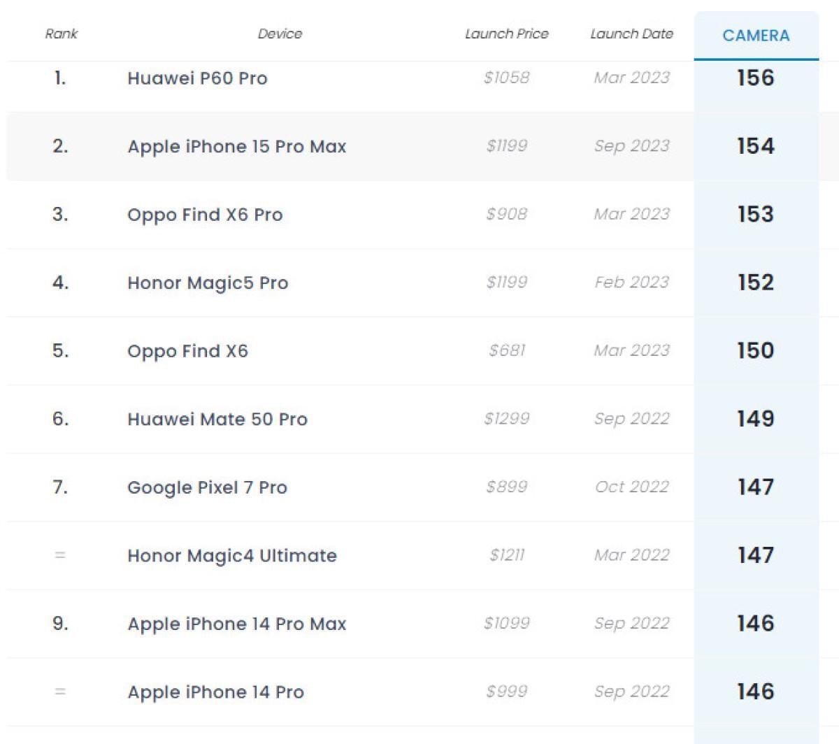 DxOMark uzmanlarından 154 puan almayı başaran iPhone 15 Pro Max, 156 puana sahip Huawei P60 Pro'nun hemen arkasında yer aldı.