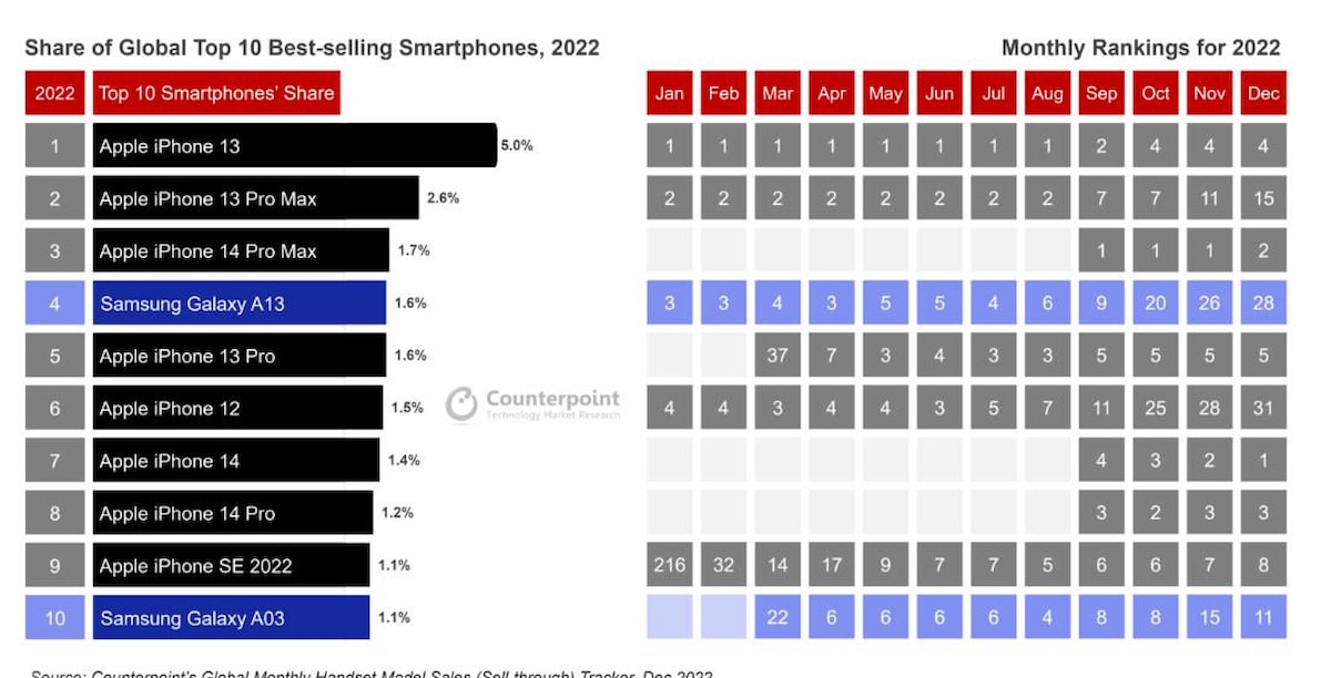 2022'de en çok satılan 10 telefonun aylara göre sıralaması:
