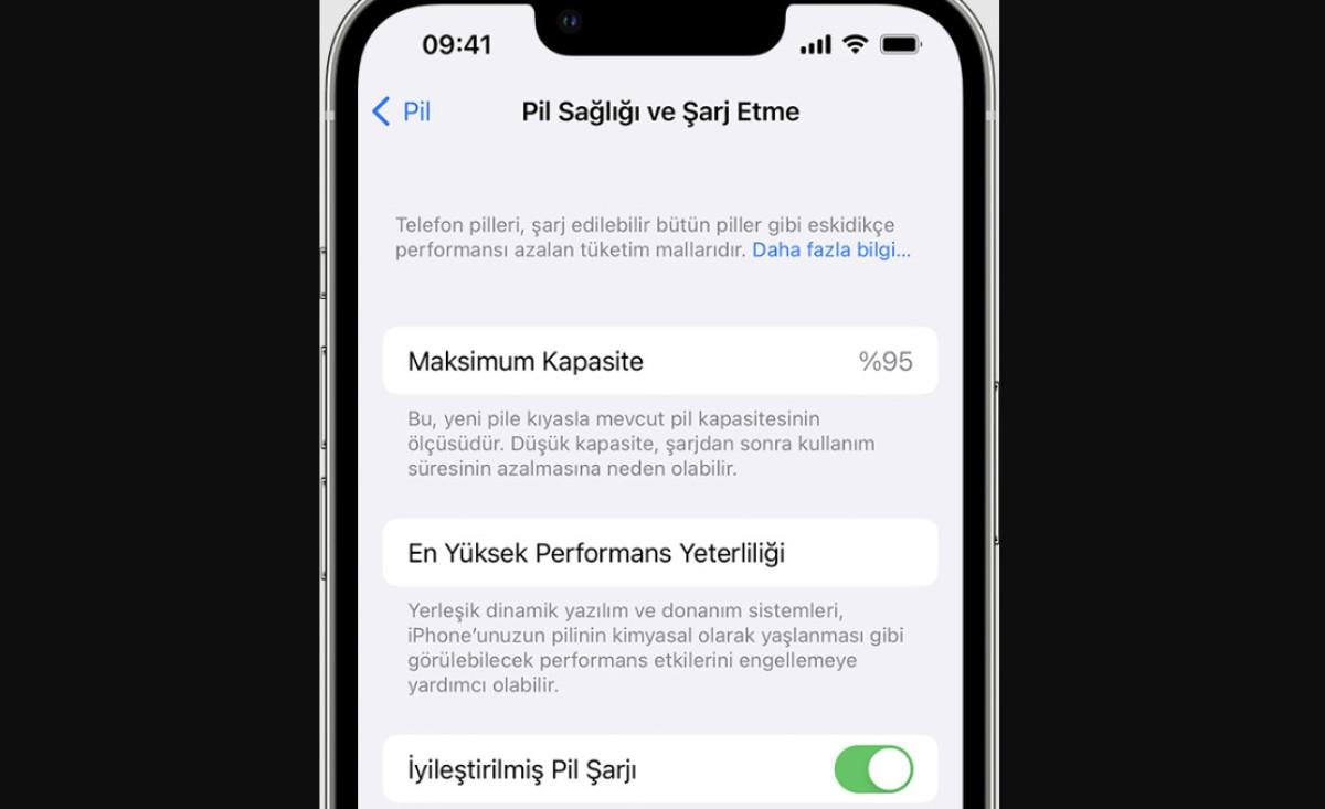 iPhone; pilinizin kapasitesi, en yüksek performansı ve pilinizin servise gösterilmesi gerekip gerekmediği ile ilgili bilgiler görüntüler.