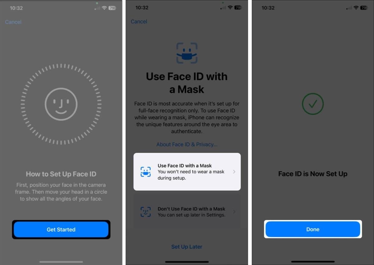 Bitirdiğinizde, Face ID'yi bir maske ile ayarlamanız istenebilir. Seçeneklerden seçiminizi yapın.