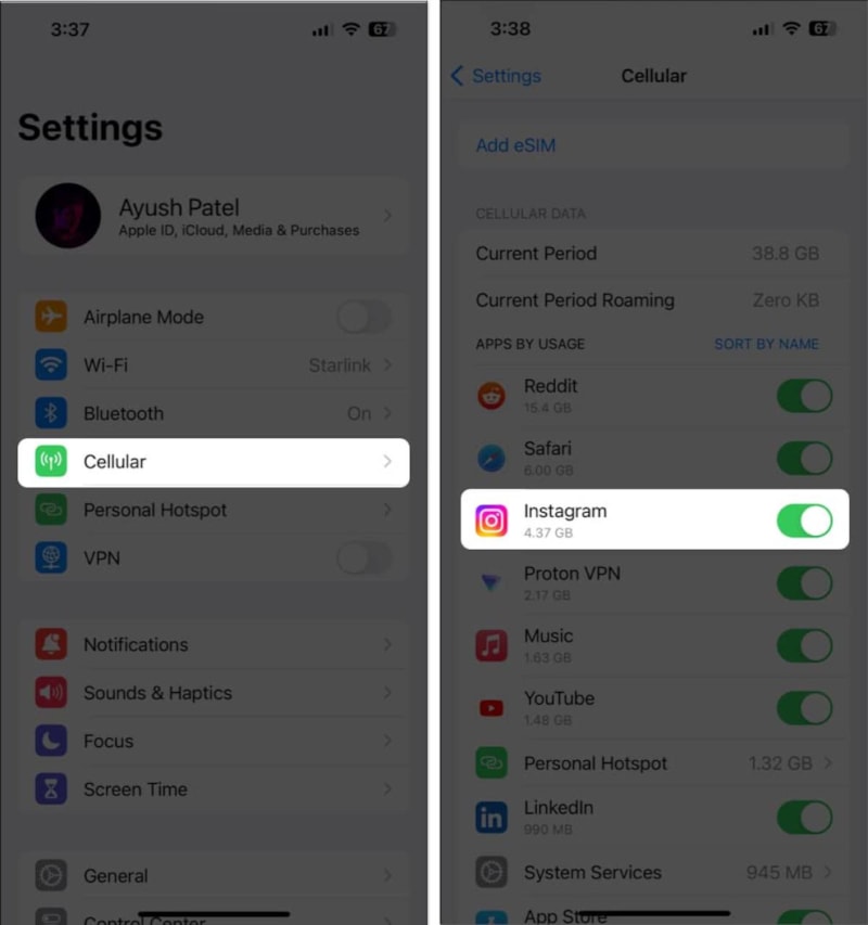Aşağı kaydırın ve Instagram'ı aktif ederek hücresel veri izni verin.