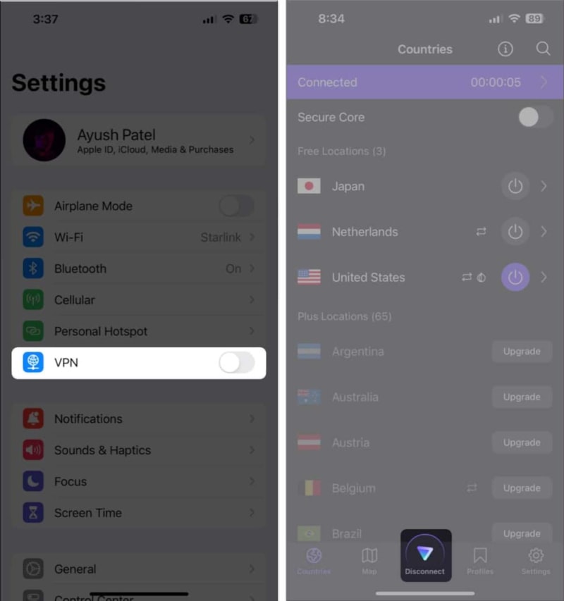 iPhone'unuzun VPN'ye bağlı olmadığından emin olmak için Ayarlar uygulaması → VPN'yi kapat seçeneğine gidin.