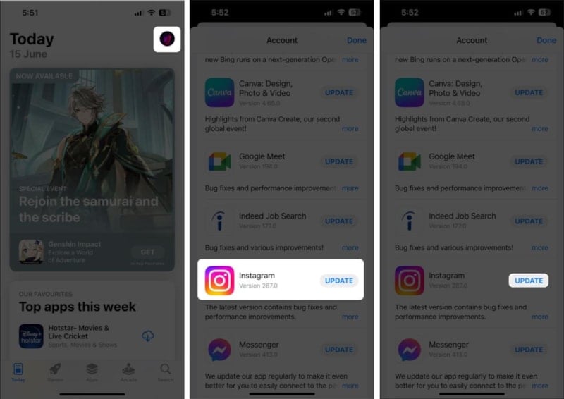 Bu tür sorunları düzeltmek istiyorsanız Instagram uygulamasını güncellemeniz veya herhangi bir güncelleme mevcut değilse yeniden yüklemeniz gerekir.