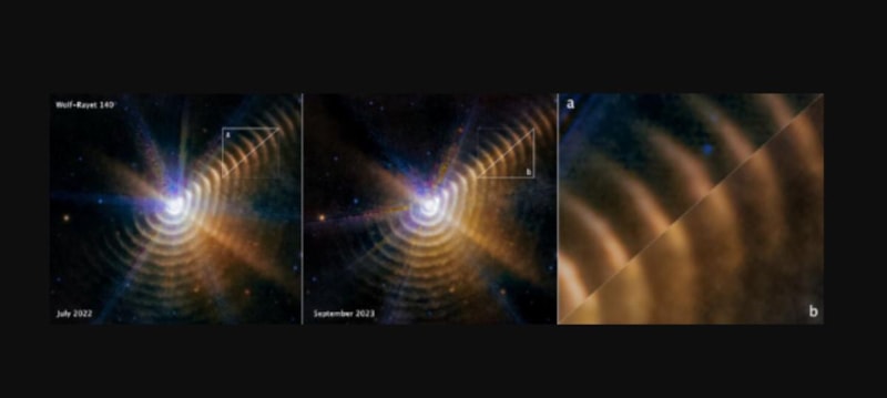 JWST, WR 140'ı 2016'daki son geçişinden yaklaşık 5,5 yıl sonra görüntüledi. Yaklaşık 14 ay sonra aynı sistemi tekrar gözlemleyen JWST, toz halkalarının nasıl genişlediğini ortaya koydu.