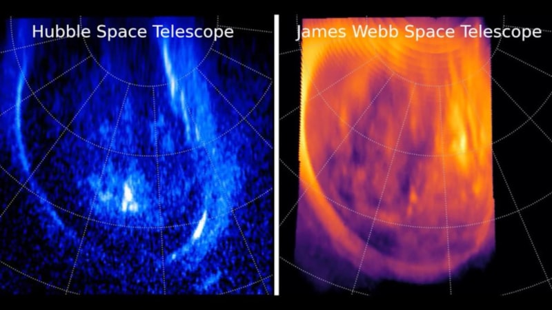 İlginç bir şekilde, Hubble Uzay Teleskobu da aynı Jüpiter aurora olayını yakaladı, ancak Webb'in gördüğü en parlak ışığın Hubble görüntülerinde bir karşılığının olmaması bilim insanlarını şaşırttı.