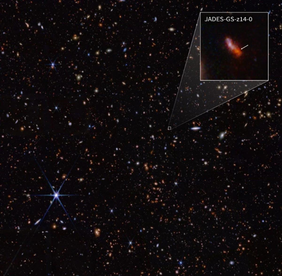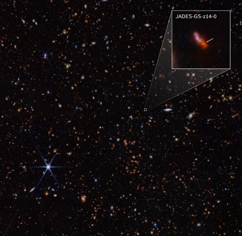 JADES-GS-z14-0" olarak isimlendirilen galaksi, şaşırtıcı derecede parlak ve bin 600 ışık yılı genişliğinde.
