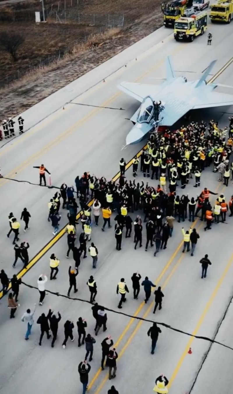 Mühendislerimiz, KAAN'ın başarılı geçen ilk uçuşu sonrası piste iner inmez, uçağın yanına koşarak sevinçlerini eserlerinin yanında yaşamak istedi.