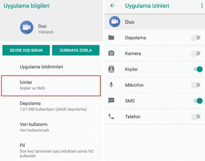 İzinler'e dokunun. Uygulama için herhangi bir izni onayladıysanız veya reddettiyseniz burada görebilirsiniz. Bir izin ayarını değiştirmek için izne dokunun, ardından İzin ver veya İzin verme'yi seçin.