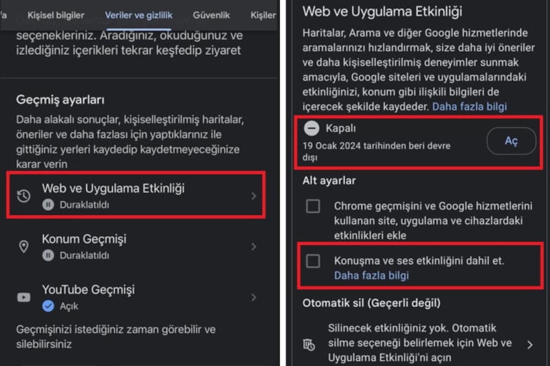 Açılan sayfada bu ayarı kapalı hale getirin. Konuşma ve ses etkinliğini dahil et seçeneğinin işaretini kaldırın.