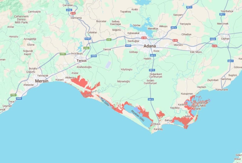 Nitekim, haritaya yakından baktığımızda, Türkiye'nin kıyı şeridinin de risk altında olduğunu görüyoruz. Ege bölgesinde İzmir, Akdeniz'de ise Antalya, Mersin ve Adana bölgelerinde bulunan bazı kıyı şeritleri tehlikede.