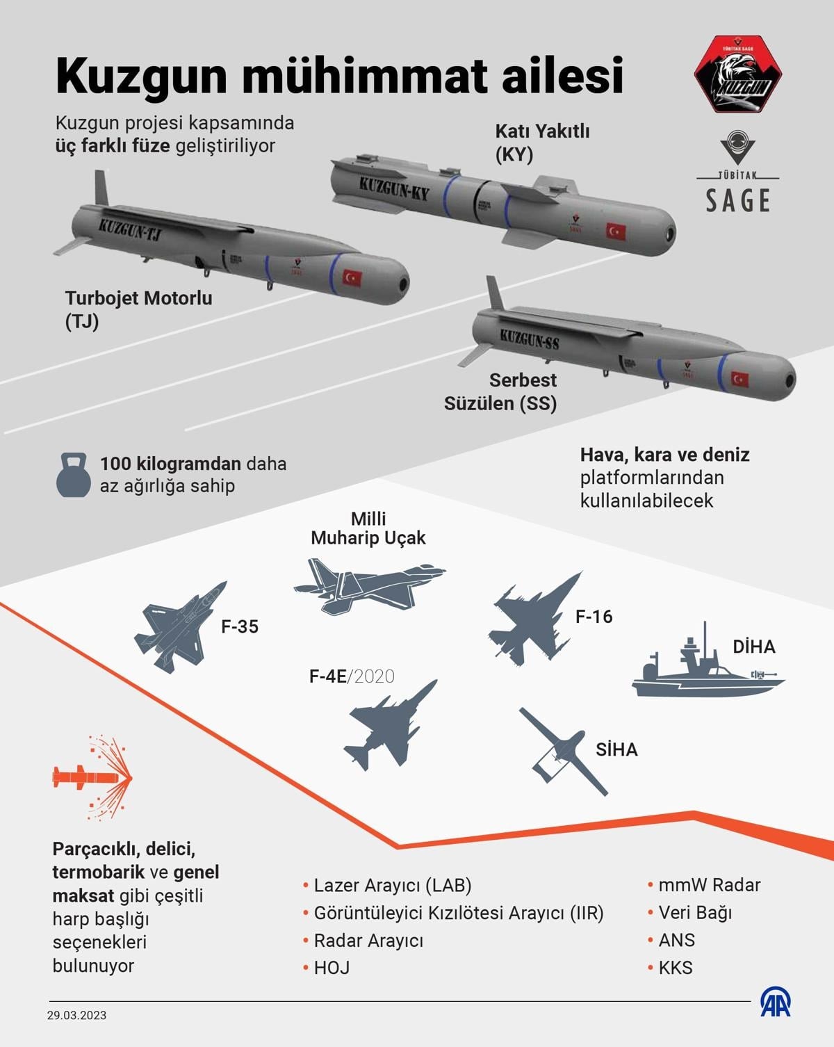Kuzgun ailesi Milli Muharip Uçak, F-35, F-4E/2020, F-16 ve S/İHA gibi hava platformlarının yanı sıra, kara ve deniz platformlarından da kullanılabilecek müşterek bir yapıya kavuşacak.