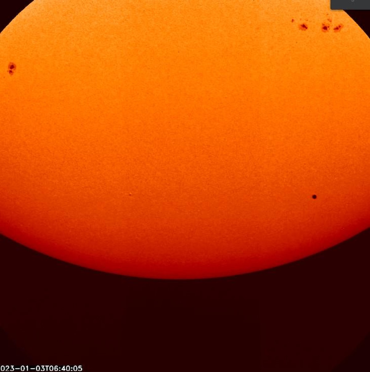Merkür Dünya'nın yaklaşık üçte biri büyüklüğünde ve Güneş'in 1.384.000 kilometrelik çapının yanında ufacık görünüyor.