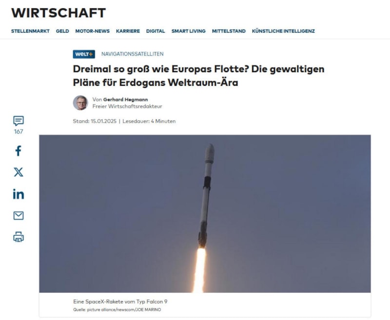 Alman Welt gazetesi, Türkiye'nin milli uydusu Fergani FGN-100-d1'e geniş bir yer vererek, uzaya fırlatılmasını detaylı bir şekilde ele aldı.