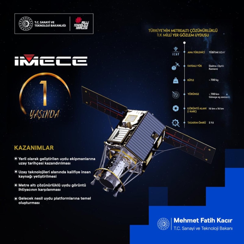 Sanayi ve Teknoloji Bakanı Mehmet Fatih Kacır, Türkiye’nin ilk yüksek çözünürlüklü yerli ve milli gözlem uydusu İMECE'nin uzaydaki birinci yılını tamamladığını duyurdu.