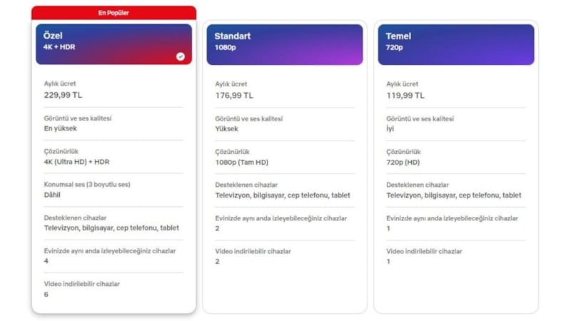 Kullanıcılara 4K çözünürlük sunan "Özel Plan"ın fiyatı ise 199,99 TL'den 229,99 TL'ye çıktı.