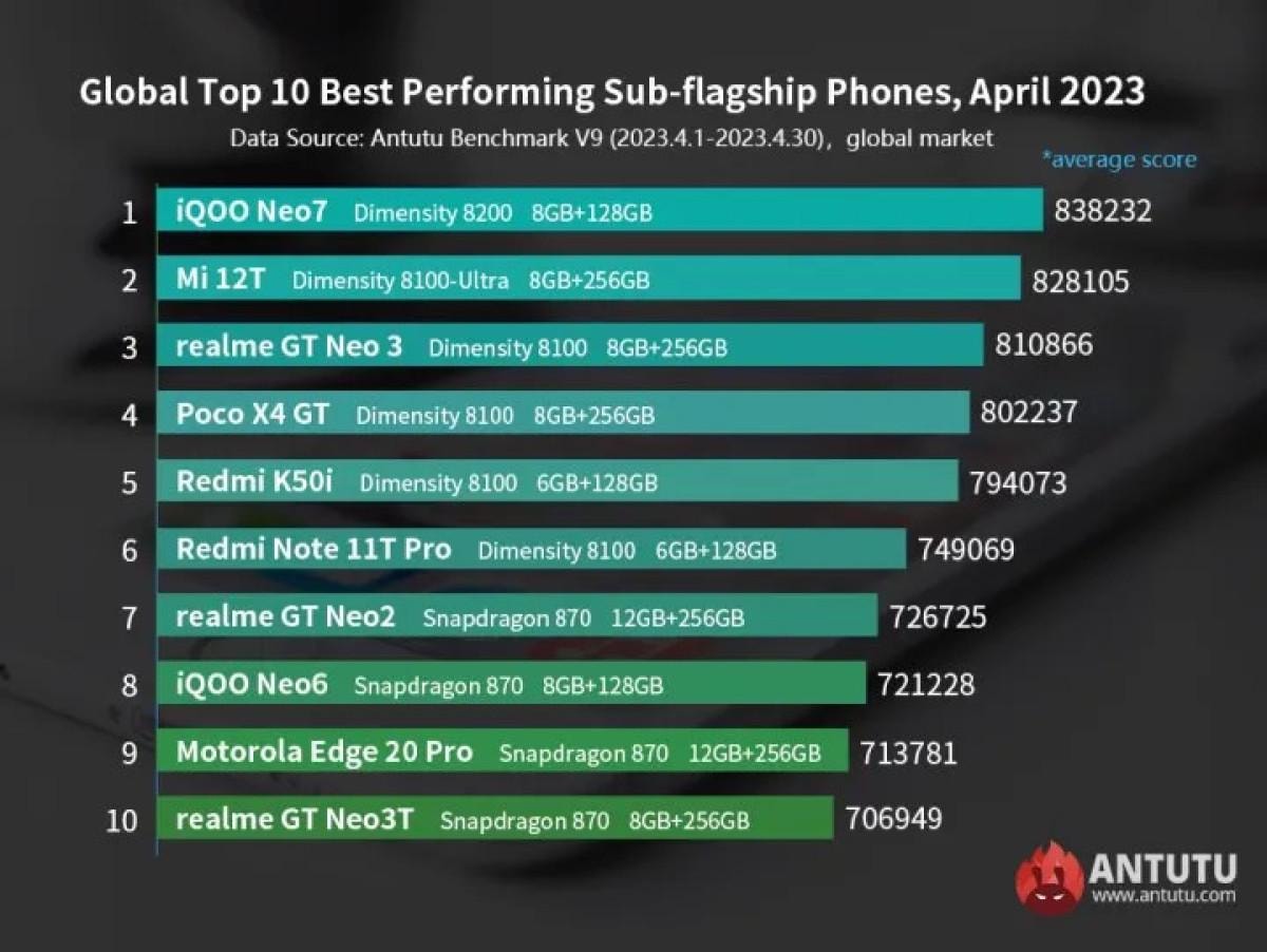Nisan ayının en iyi orta segment telefonu, 838 bin 232 puan alan IQOO NEO 7 oldu. MediaTek Dimensity 8200 işlemcisinden güç alan telefonda, 8GB RAM ve 128GB depolama alanı yer alıyor.