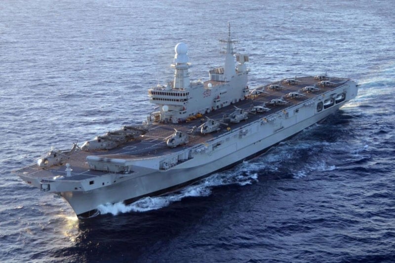 850 feet uzunluğa ve yaklaşık 35 bin ton ağırlığa sahip olan Cavour, sabit kanatlı uçak yeteneklerini helikopter operasyonlarıyla birleştiren benzersiz bir tasarıma sahip bir uçak gemisidir.