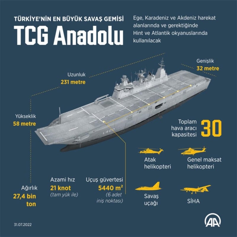 Tam yüklü deplasmanda 27 bin 436 ton ağırlıkta, 231 metre boyunda ve 32 metre genişliğinde inşa edilen Çok Maksatlı Amfibi Gemi TCG Anadolu; Ege, Karadeniz ve Akdeniz harekat alanlarında ve gerektiğinde Hint ve Atlantik okyanuslarında kullanılabilecek.