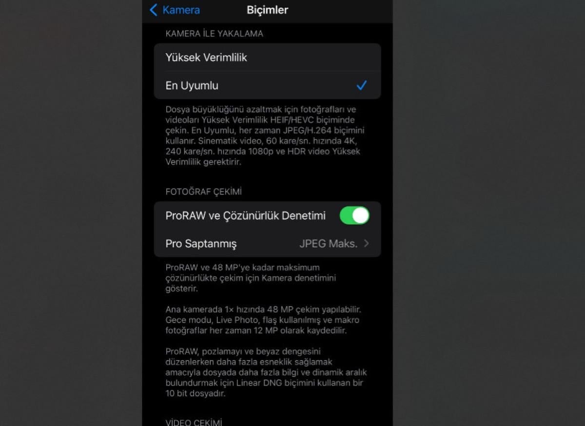 iPhone modelinize bağlı olarak ProRAW ve Çözünürlük Denetimi veya Çözünürlük Kontrolü yanındaki seçeneği açık duruma getirin.