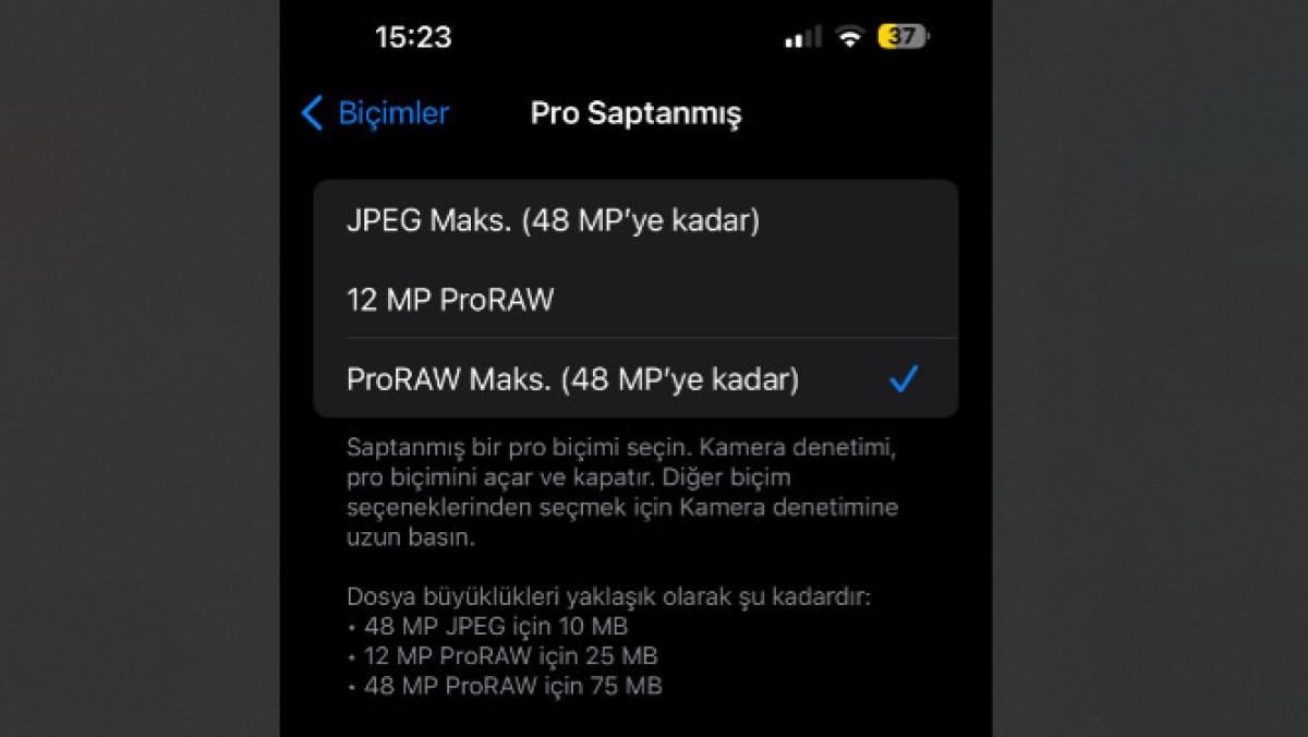 iPhone 15 serisi dışındaki modellerde ProRAW'ın görüntü boyutu 100 MB veya daha fazlasına çıkabilir..