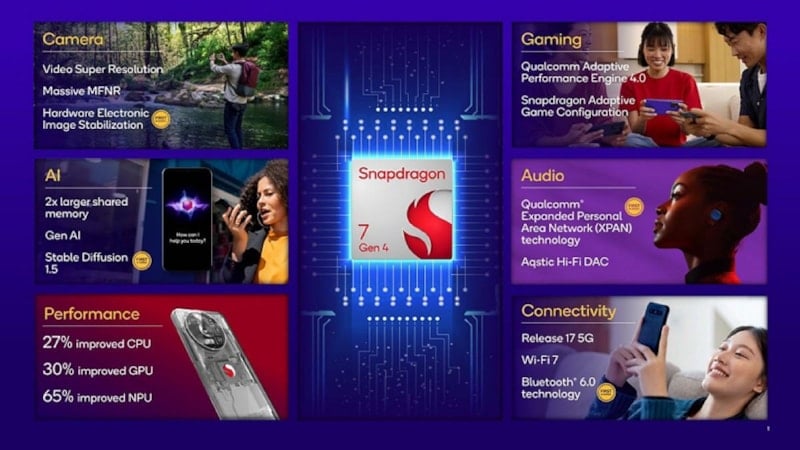 Bağlantı tarafında ise 6 GHz altı 5G, Wi-Fi 7 ve Bluetooth 6.0 desteği sunan Snapdragon 7 Gen 4, aptX Lossless ve aptX Adaptive ses kodeklerini de destekliyor.
