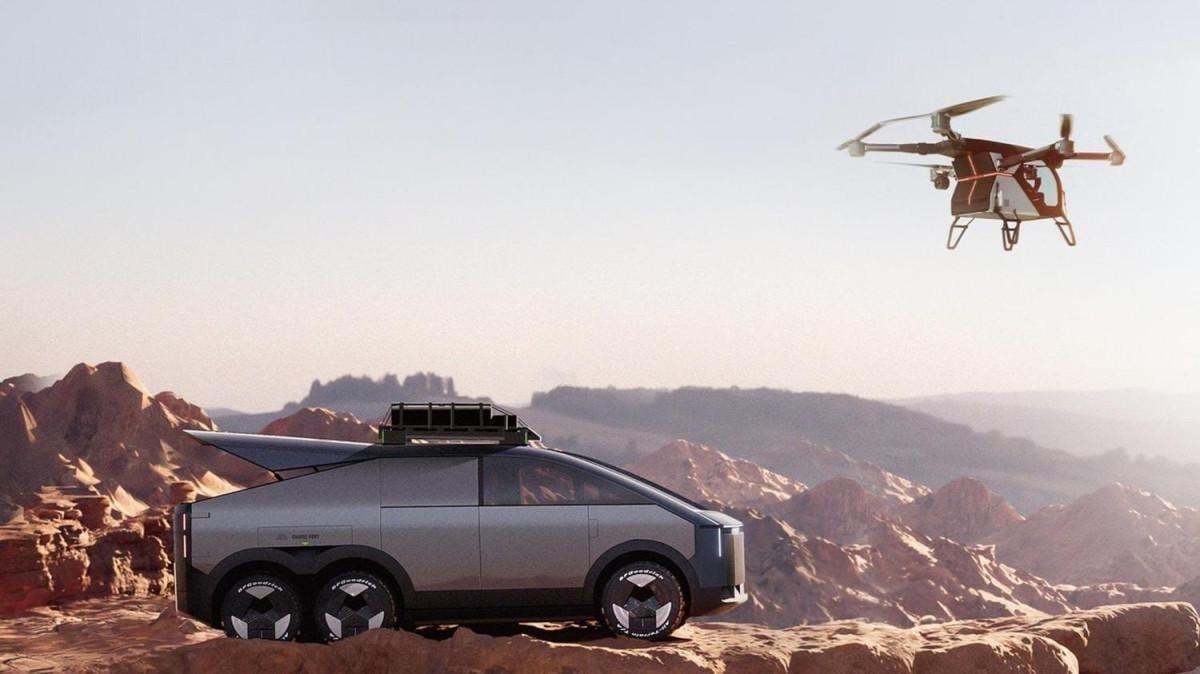 Altı tekerlekli ana araç Tesla'nın Cybertruck kamyonetine oldukça benziyor. İçinde taşıdığı elektrikli drone ise manuel ve otomatik idare edilebiliyor ve iki kişiyi taşıyabiliyor.