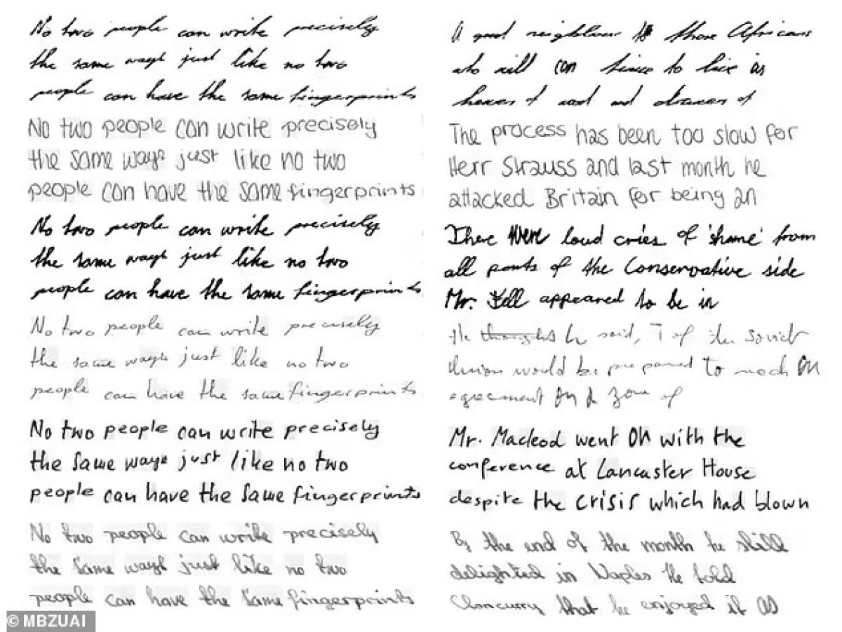 Sağdaki sütun, ekibin yapay zekasının eğitildiği altı farklı insan yazarın el yazısı örneğinden oluşuyor.