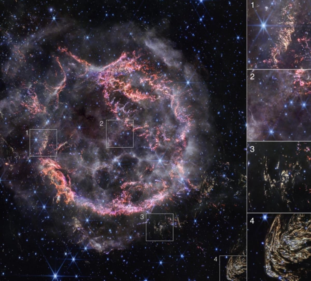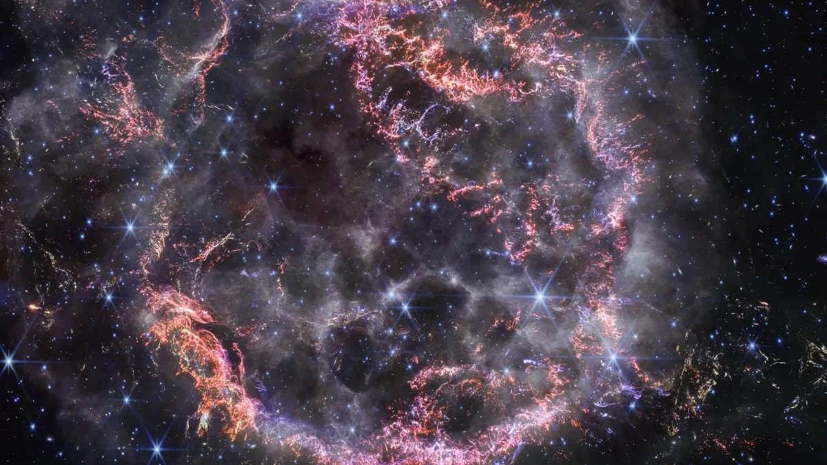 Yeni NIRCam görüntüsünde, süpernova kalıntısının iç kısmında etkileşim sonucu oluşan turuncu ve açık pembe renk parıltıları hakim.