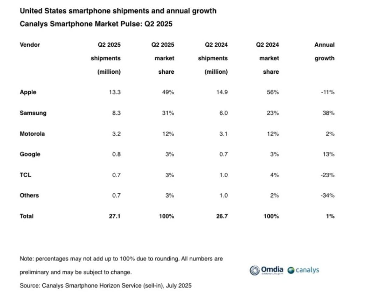Samsung, 2025'in ikinci çeyreği (nisan-haziran) itibarıyla ABD pazar payında ezeli rakibi Apple'ın yalnızca yüzde 18 gerisinde bulunuyor.